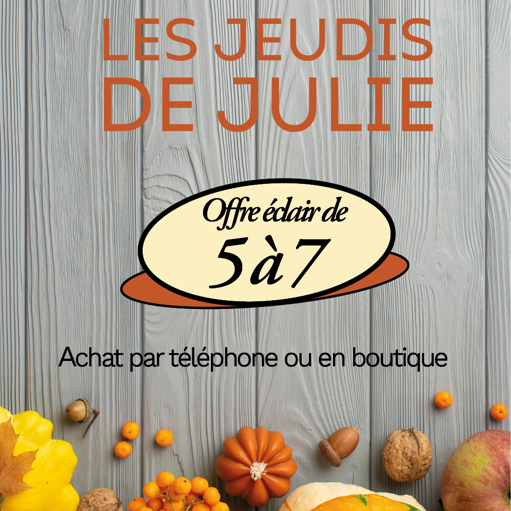 Des offres exclusives, valables pendant seulement quelques heures… et après c’est fini ! Les prochains Jeudis de Julie auront lieu aux dates suivantes de 17 h à 19 h:
